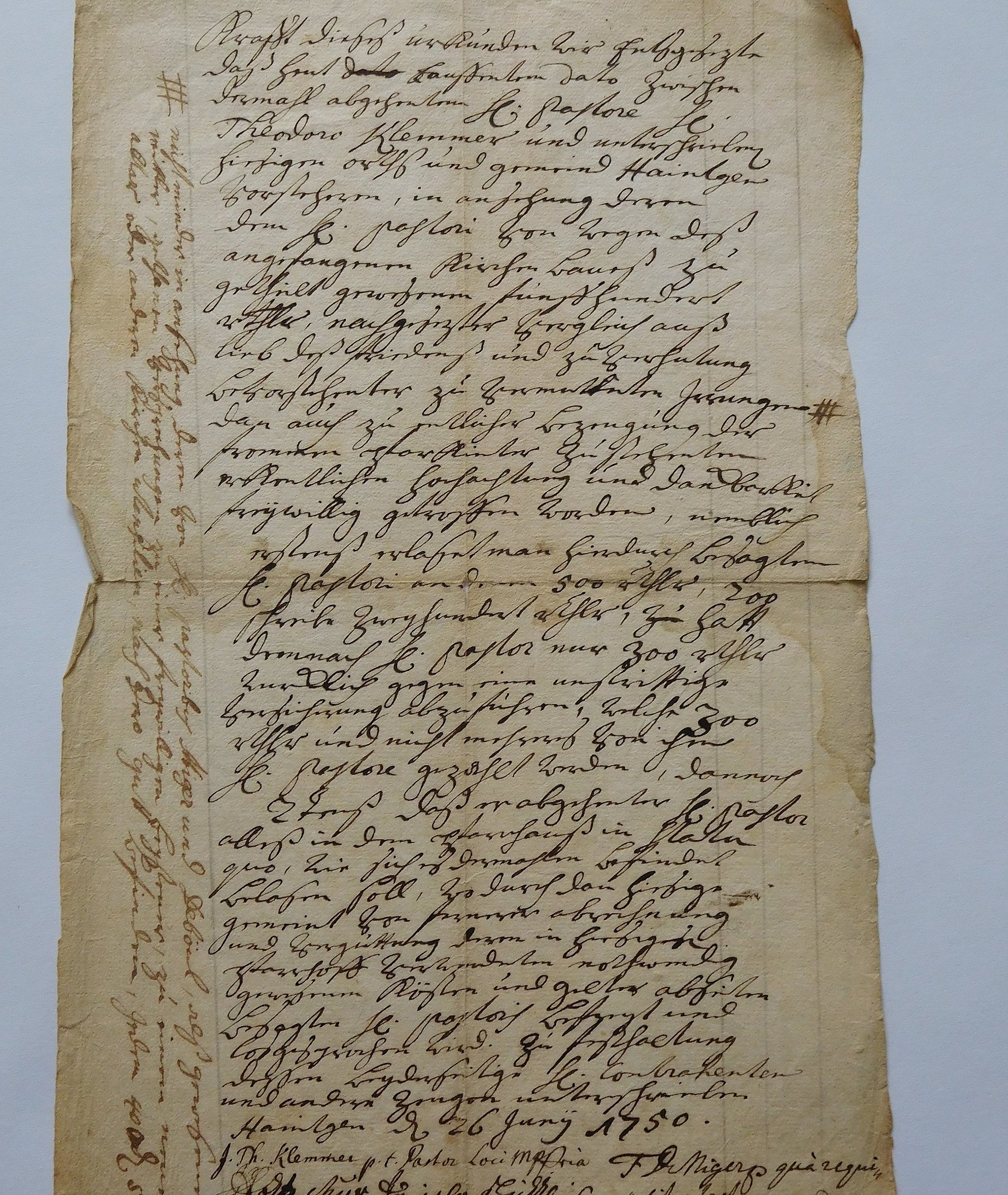 Kraft dieses urkunden wir Endsgesetzte, dass heute laufenden Datums zwischen [dem] dermal abgehenden H[errn] Pastor H. Theodoro Klemmer[7] und unterschriebenen, hiesigen Orts und Gemeinde Haintchen Vorstehern, in Ansehung deren dem H. Pastor von wegen des angefangenen Kirchenbaues zugeteilt gewesenen fünfhundert R[eic]h[s]t[a]l[e]r[8], nachgesetzter Vergleich aus Lieb des Friedens und zu Verhütung bevorstehender zu vermutenden Irrungen anicht minder in Ansehung deren von [den] H. Pastoren Miger[9] und Deboul[10], als gewesenen Mittlern, getanen Versprechung zu einer freiwilligen Beisteuer zu einem neuen Altar oder anderen Kirchenutensilien[11], nach deren Gutbefinden, jedem 40 bis 50 Guldena dann auch zu endlicher Bezeugung der frommen Pfarrkinder zustehenden erkenntlichen Hochachtung und Dankbarkeit freiwillig getroffen worden, nämlich erstens erlässt man hierdurch besagtem H. Pastor an den 500 Rhtlr 200 schreibe zweihundert Rhtlr hat demnach H. Pastor nur 300 Rhtlr wirklich gegen eine unstrittige Versicherung abzuführen, welche 300 Rhtlr und nicht mehr von ihm H. Pastor gezahlt werden[12], dann noch 2tens, dass er, der abgehende H. Pastor, alles in dem Pfarrhaus in statu quo, wie [es] sich dermalen befindet, belassen soll, wodurch dann hiesige Gemeinde von fernerer Abrechnung und Vergütung deren im hiesigen Pfarrhof verwendeten notwendig gewesenen Kosten und Gelder absehen, besagter H. Pastor befreit und losgesprochen wird. Zu Festhaltung dessen beiderseitige H. Contrahenten und andere Zeugen unterschreiben