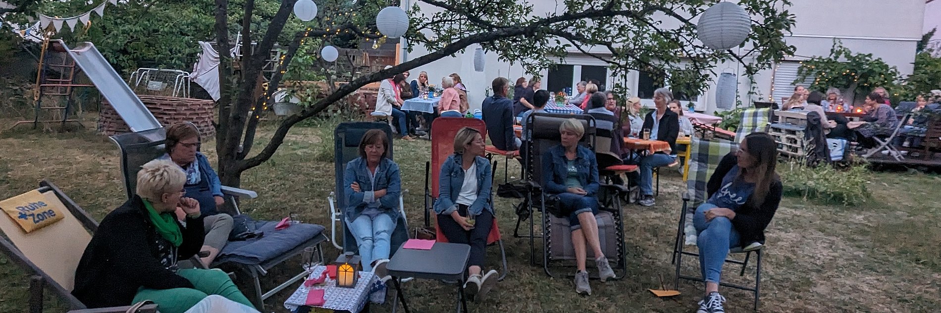 Wie bereits im vergangenen Jahr lud das Team der Katholischen Öffentlichen Bücherei St. Nikolaus Haintchen zum Sundowner in den Garten zwischen Pfarrhaus und Pfarrheim ein. Schon der vorhergehende Gottesdienst wurde vom Büchereiteam mitgestaltet und stimmte gut auf die Veranstaltung ein. Über fünfzig Personen erlebten einen stimmungsvollen Abend bei angenehmen Temperaturen mit köstlichen Cocktails oder Eistee und liebevoll vorbereiteten Snacks.