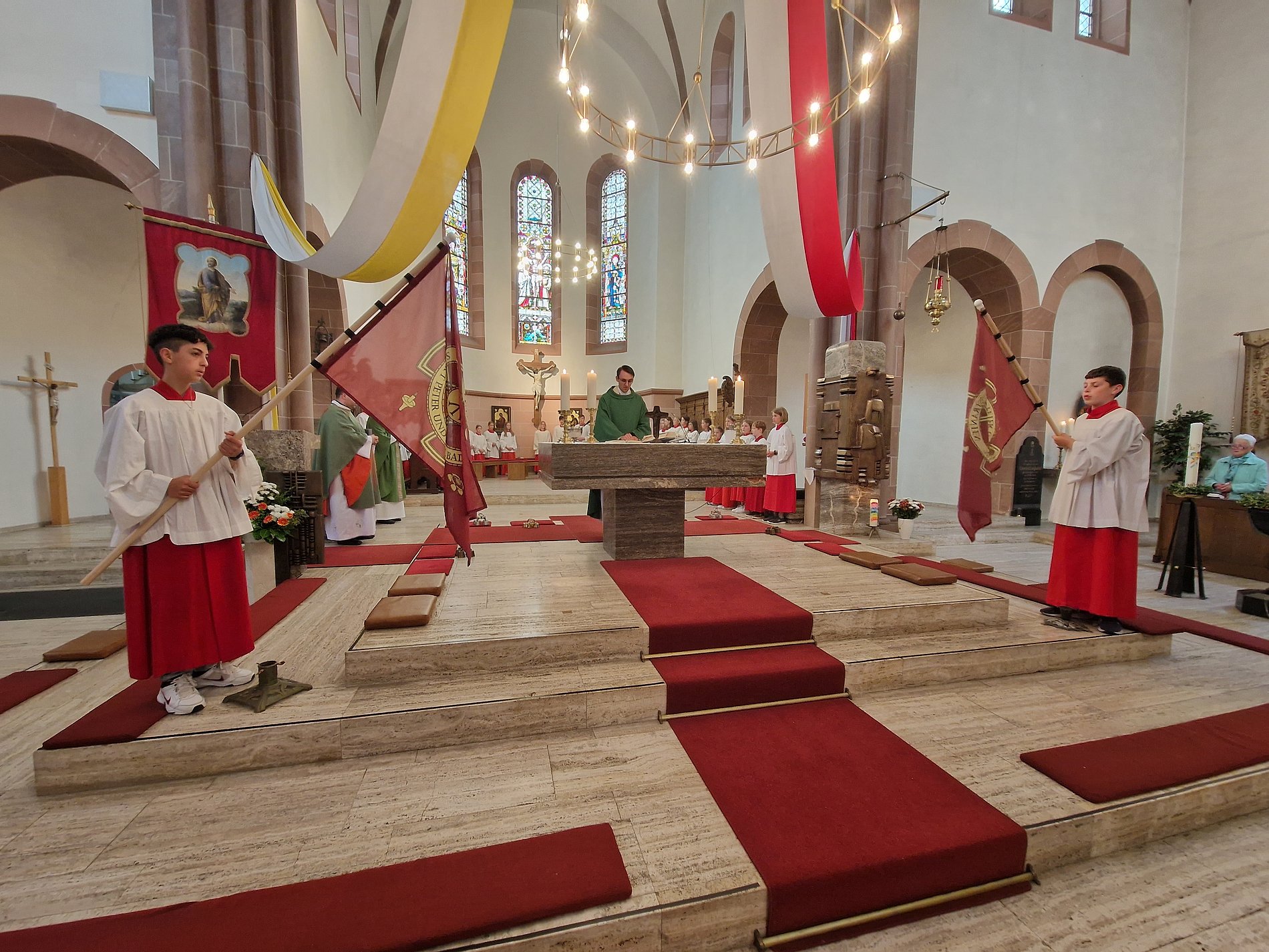 Nachdem alle Messdiener angekleidet waren, ging um 17 Uhr die Messe los. Neun Weihrauchfässer vorneweg, gefolgt von allen Messdienern, Kaplan Varga, Pfarrer Wichmann und Kaplan Kruszewski. Zu Beginn der Messe wurden die zwei neuen Messdienerfahnen gesegnet, die als Erkennungszeichen der Messdienergemeinschaft dienen sollen.