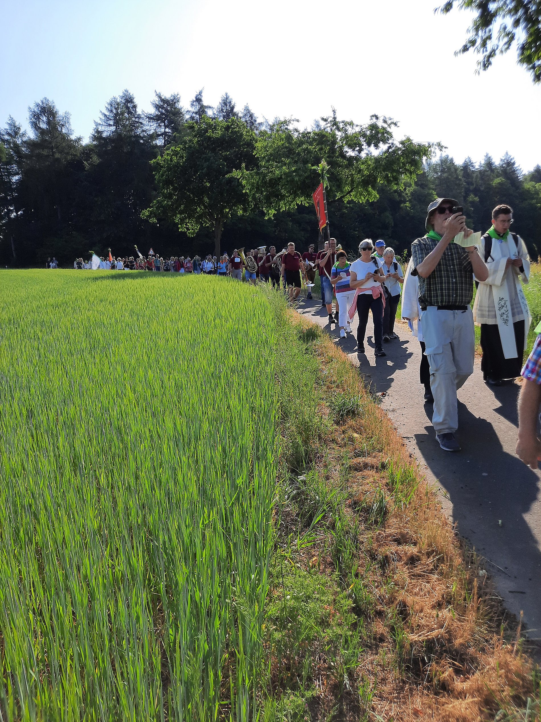 Am Oktavtag von Fronleichnam wurde der „Große Wallfahrtstag“ in Marienstatt begangen. In den frühen Morgenstunden fuhren die Pilgerinnen und Pilger aus der Pfarrei St. Peter und Paul Bad Camberg mit einem Bus nach Mörlen/WW. Dort trafen sie mit den Wallfahrern aus Hofheim zusammen, mit Pfarrer Helmut Gros und seinem Kaplan. Die 10 km lange Fußwallfahrt nach Kloster Marienstatt wurde wieder von zahlreichen Pilgermusikanten begleitet, die zwischen den Gebetsabschnitten des Rosenkranzes Muttergotteslieder spielten. In die Bitten wurden die Kinder, Jugendlichen, Familien, Kranken und alten Menschen eingeschlossen; und besonders um den Frieden gebetet.