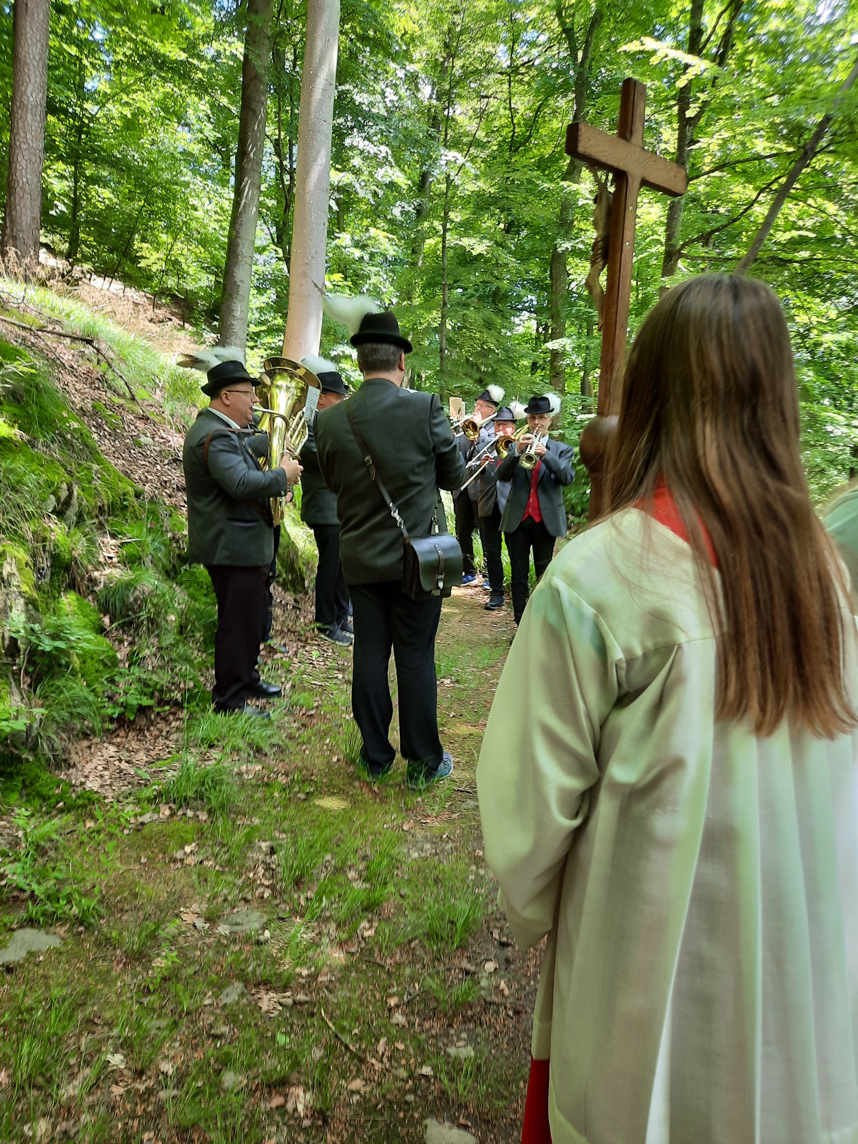 An jedem großen Wallfahrtsort sind Kreuzwegstationen angelegt. Die Gelegenheit zu einer nachdenklichen und besinnlichen Kreuzwegandacht im nahegelegenen Wald wurde angeboten, die von vielen Menschen auch angenommen wurde. Dabei eine Musikgruppe, die den musikalischen Rahmen gestaltete.