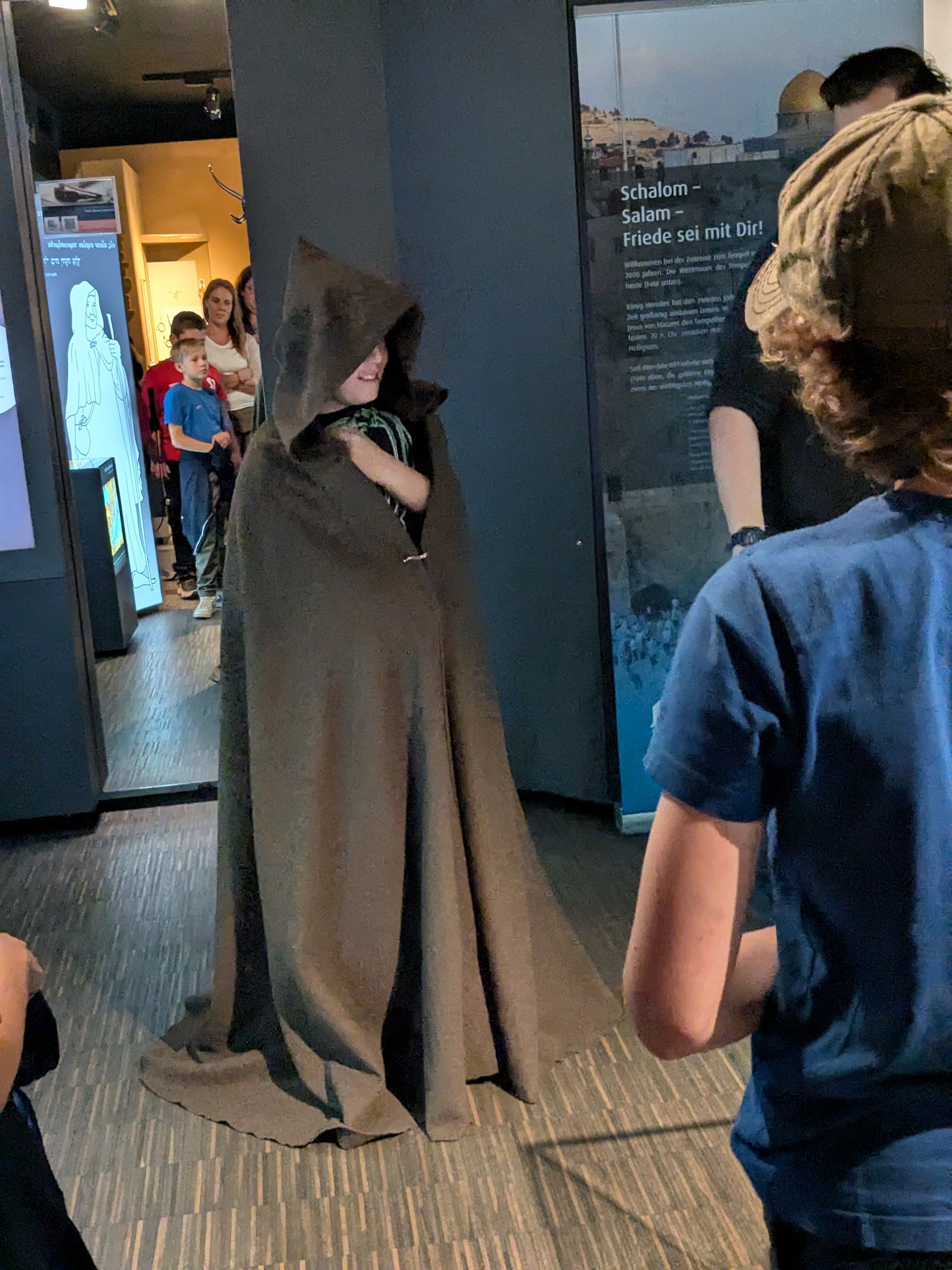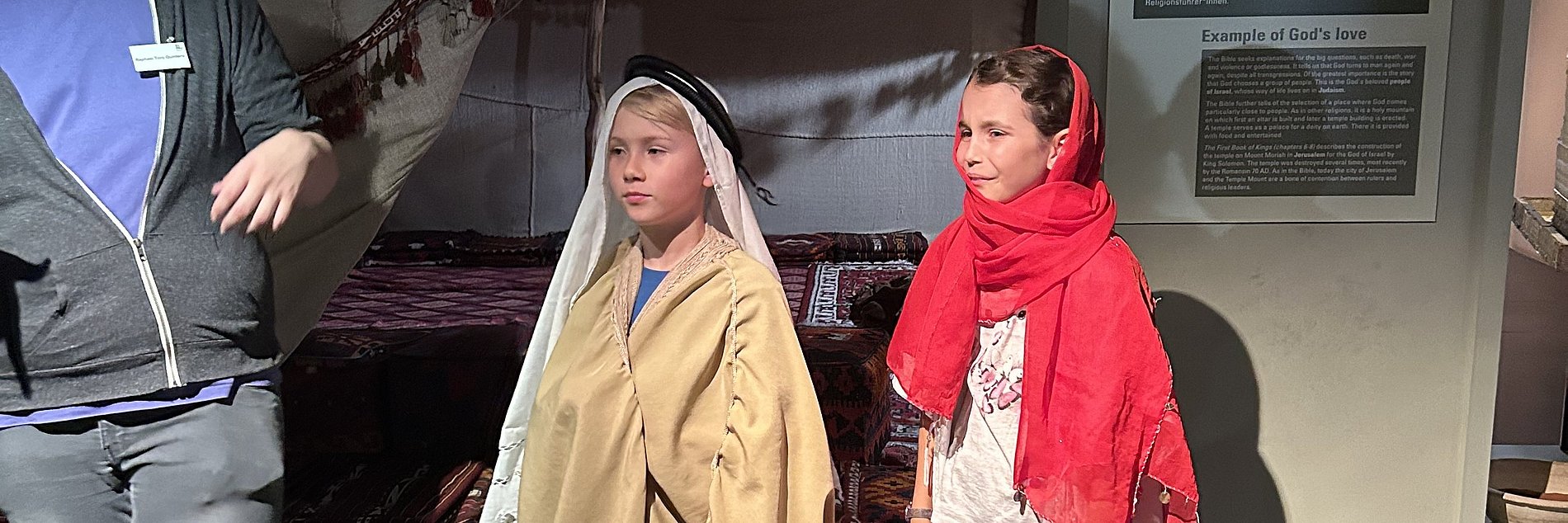 Das Bibelhaus verfügt über ein Modell des Tempel Salomons. Die Gruppe erinnerte sich an die Geschichte von Mose, die lange Wanderung der Israeliten und erfuhr viel über die sich im Laufe der Zeit ausprägenden Riten und Gebräuche. Die Kinder versetzten sich in die Pilger und überlegten, wie sich das Geschehen im Tempel vermutlich dargestellt hat. Sie probierten auch das traditionelle Pilgergewand aus: einen sehr praktischen Sonne-/Regen-/Wind-/Staubschutz, Decke und Schlafsack, unter Verwendung des Wanderstabs auch als Zelt verwendbar. Das ist ja toll! Das wollten alle nach Hause mitnehmen!