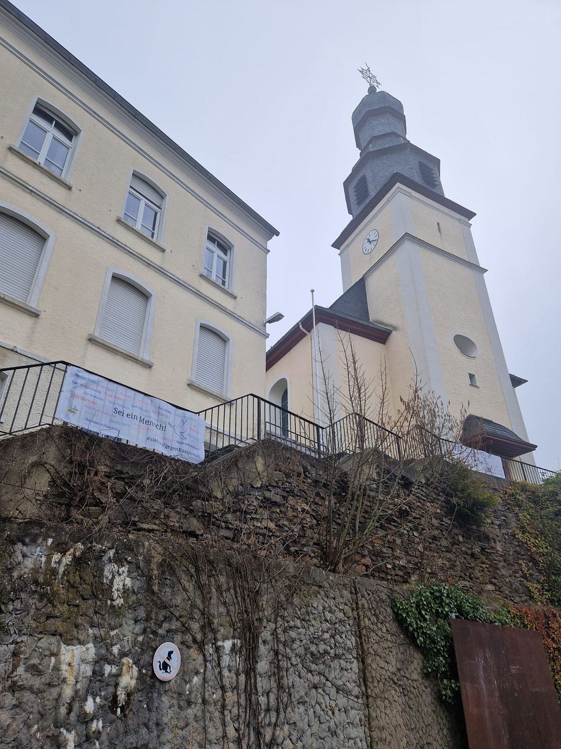 Daher hat der Ortsausschuss Hasselbach auch beschlossen, ein sichtbares Zeichen nach außen zu tragen. An der Hasselbacher Kirchentreppe befinden sich Banner mit der Aufschrift "Sei ein Mensch" in vielen verschiedenen Sprachen und der Hashtag "#stehaufgegenRassismus".