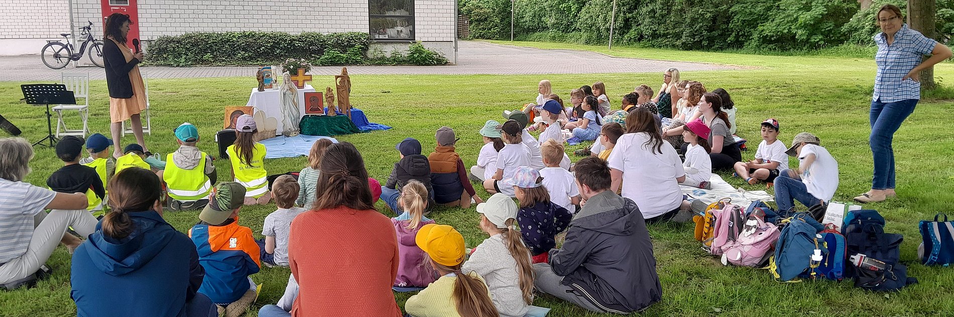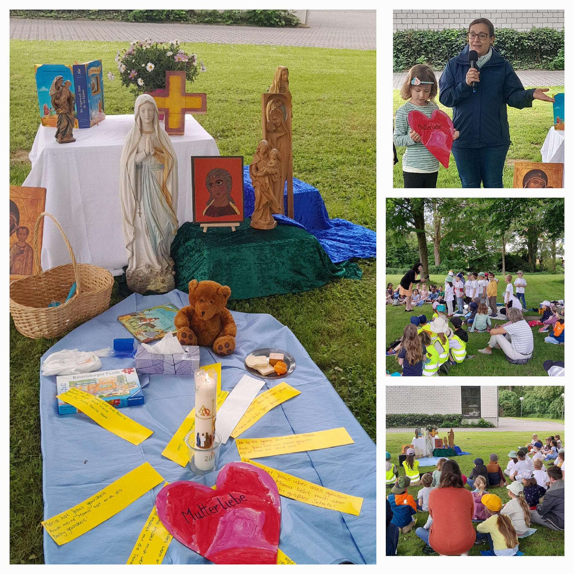Aus allen Richtungen kamen die Kinder auf das Gelände neben dem Bürgerhaus. Doch die Kinder kamen nicht alleine, sie brachten jeweils aus ihrer Kita ihre Marienfigur oder ein Marienbild mit. So wurde der Altar reich mit Marienbilder versehen und der Gottesdienst, den die Kinder mit vorbereitet hatten, konnte beginnen. Viele Lieder, zu denen getanzt, geklatscht und sich bewegt wurde, machten den Kindern sichtlich Freude. Dabei erklärten die Kinder in der Katechese, wie wichtig eine Mutter ist und dass wir mit Maria als Mutter Jesu noch jemanden haben, der sich um uns sorgt. Dafür erfanden die Kinder auch ein ganz neues Wort, nämlich die „Mutterliebe“! Dieses Wort schrieben sie auf ein großes Herz und legten es zum Marienaltar.