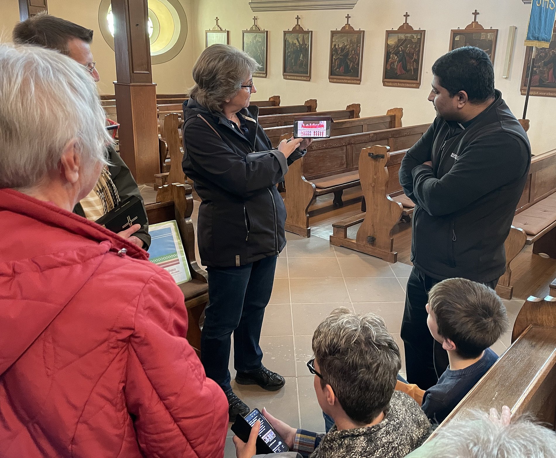 Kurz bevor sich die Gottesdienstbesucher auf den Weg zur Abendmesse nach Haintchen aufmachten, hieß es aus Rom "Habemus Papam!". Annelie Gerlach, Ortsausschussvorsitzende von Haintchen und Jonathan Honemann, Messdiener, zogen gleich die Fahne auf. In Absprache mit der Gottesdienstgemeinde wurde der Beginn der Messe ein wenig nach hinten verzögert, um zu erfahren, wer der neue Papst sei. Gespannt scharten sich die Gottesdienstbesucher um das Handy, auf dem die Live-Berichterstattung aus Rom gezeigt wurde.
