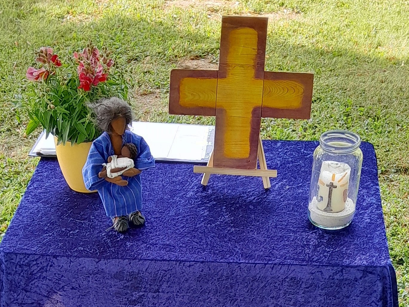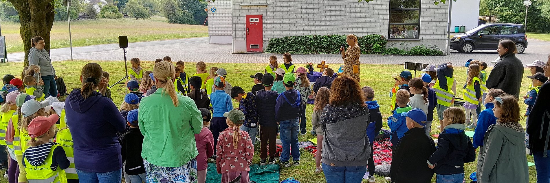 Nachdem die Vorschulkinder das Ziel auf der Wiese neben dem Bürgerhaus in Oberselters erreichten, wurde der Marienaltar noch gemeinsam weiter ausgeschmückt mit Blumen und Marienfiguren, die manche Kitas mitbringen konnten. Dann startete ein fröhlicher Gottesdienst zu Ehren Mariens, den die Vorschulkinder aus den einzelnen Einrichtungen mit vorbereitet und gestaltet haben.