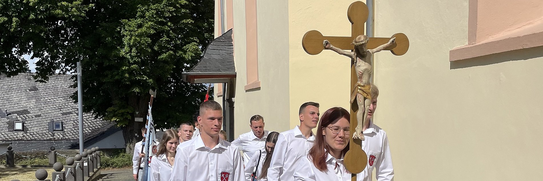 Die Lebenssituation der Kirmesmädchen und Kirmesburschen und die damit verbundenen Fragen nahm Pfarrer Wichmann zum Ausgangspunkt seiner Predigt: Ablösung vom Elternhaus und Suche nach dem eigenen Platz in der Welt. Wo lassen sich Orientierung und Halt finden? Können Glaube und Kirche hier eine Hilfe sein? Aber gibt es überhaupt Gott, und wenn ja, wie kann ein guter Gott Leid, Krankheit und Tod zulassen? Und die Kirche – eine in vielfältige Missstände verstrickte „Spaßbremse“? Auf all diese Fragen bot Pfarrer Wichmann seinen Zuhörer/-innen keine „einfachen Antworten“ an, sondern erzählte von den eigenen Glaubenserfahrungen, vom Vertrauen auf die Zusage, dass Gott alle Menschen liebt. Eine Zusage, auf die auch all die Menschen vertrauten, die in der St. Nikolaus-Kirche seit Generationen gebetet haben. Den Abschluss des Festhochamts bildete der feierliche Schlusssegen mit dem Allerheiligsten.