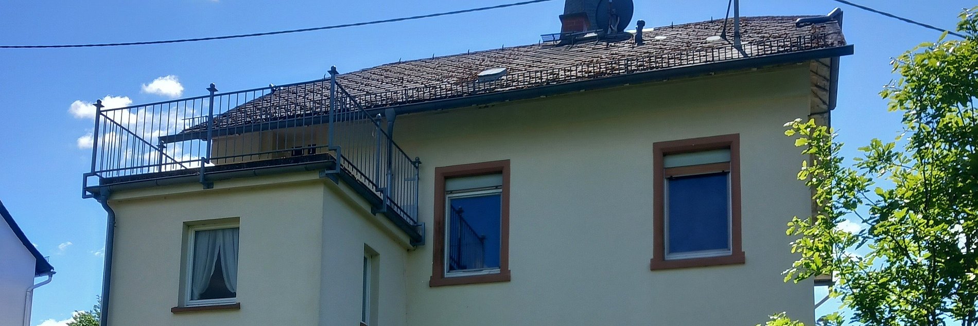 Das Wohnhaus erstreckt sich über 2 Vollgeschosse zzgl. Anbau (BJ 1953), Keller- und Dachgeschoss. Das Krüppelwalmdach ist mit Kunstschiefer belegt, die weißen Kunststoff-Fenster sind 2-fach-wärmegedämmt (1996) und verfügen über Kunststoff-Rollläden.