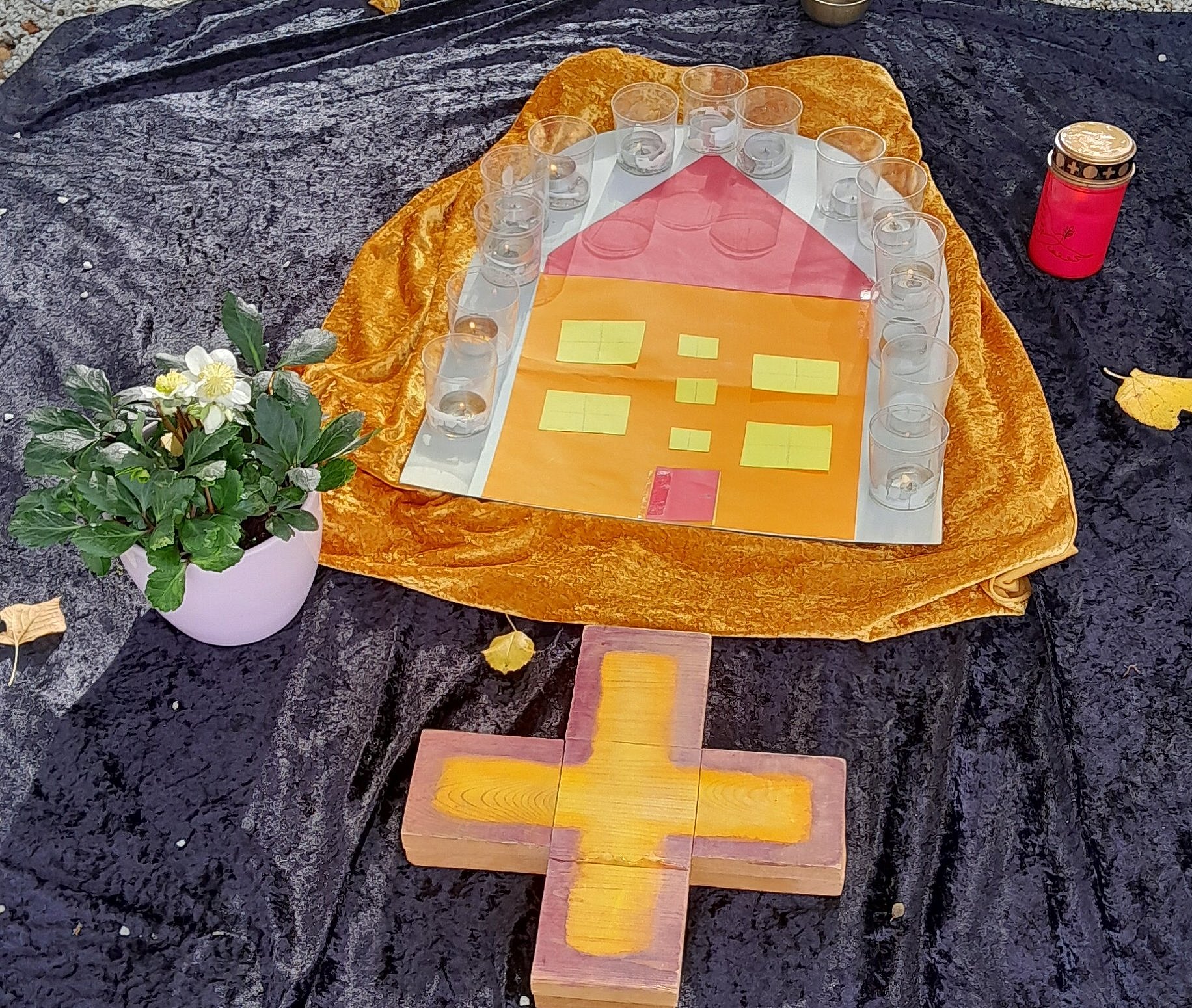 Dieser Wandel vom Tod zum Leben wurde für die Kinder „sichtbar“, in dem sich während ihrer Phantasiereise das Bild des Grabsteins in der Mitte in ein Haus mit vielen Wohnungen verwandelte. Nach einem kurzen Gespräch über dieses biblische Bild, dass uns daran erinnert, dass das Leben über den Tod hinaus weitergeht und viele Räume der Liebe eröffnet, hatten die Kinder auch Freude daran, ihre Namenskerzen in dieses Haus stellen zu dürfen.