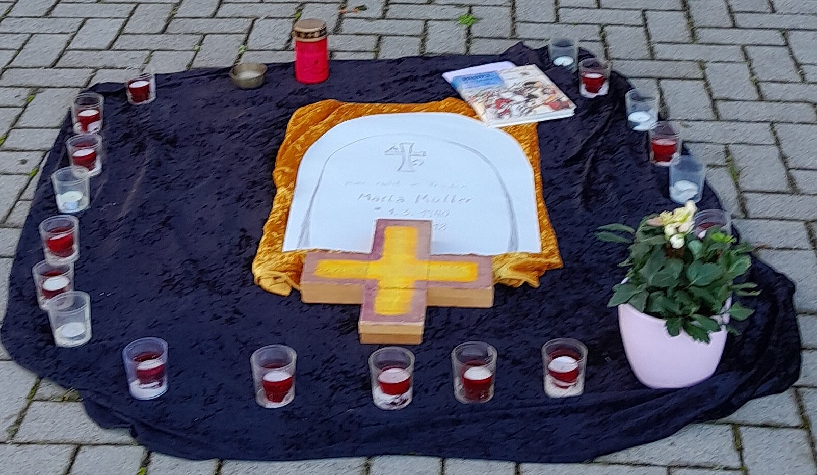 Es ist Anfang November. Draußen in der Natur wird es kälter und ungemütlicher. Die Sonne zeigt sich nur noch selten und es wird schon früh am Tag dunkel. Der Herbst hat die Blätter bunt verfärbt, viele lässt er schon von den Bäumen fallen und sie fangen an, auf dem Boden zu verwelken. Dies können die Kinder schon auf dem Weg von ihrer Kita zum Friedhof entdecken, wo sie dann an der Trauerhalle ihre gemeinsame Gedenkfeier beginnen. In ihrer Mitte liegt ein gemalter Grabstein und jedes Kind wird mit seinem Namen begrüßt und es darf für sich eine Kerze entzünden.